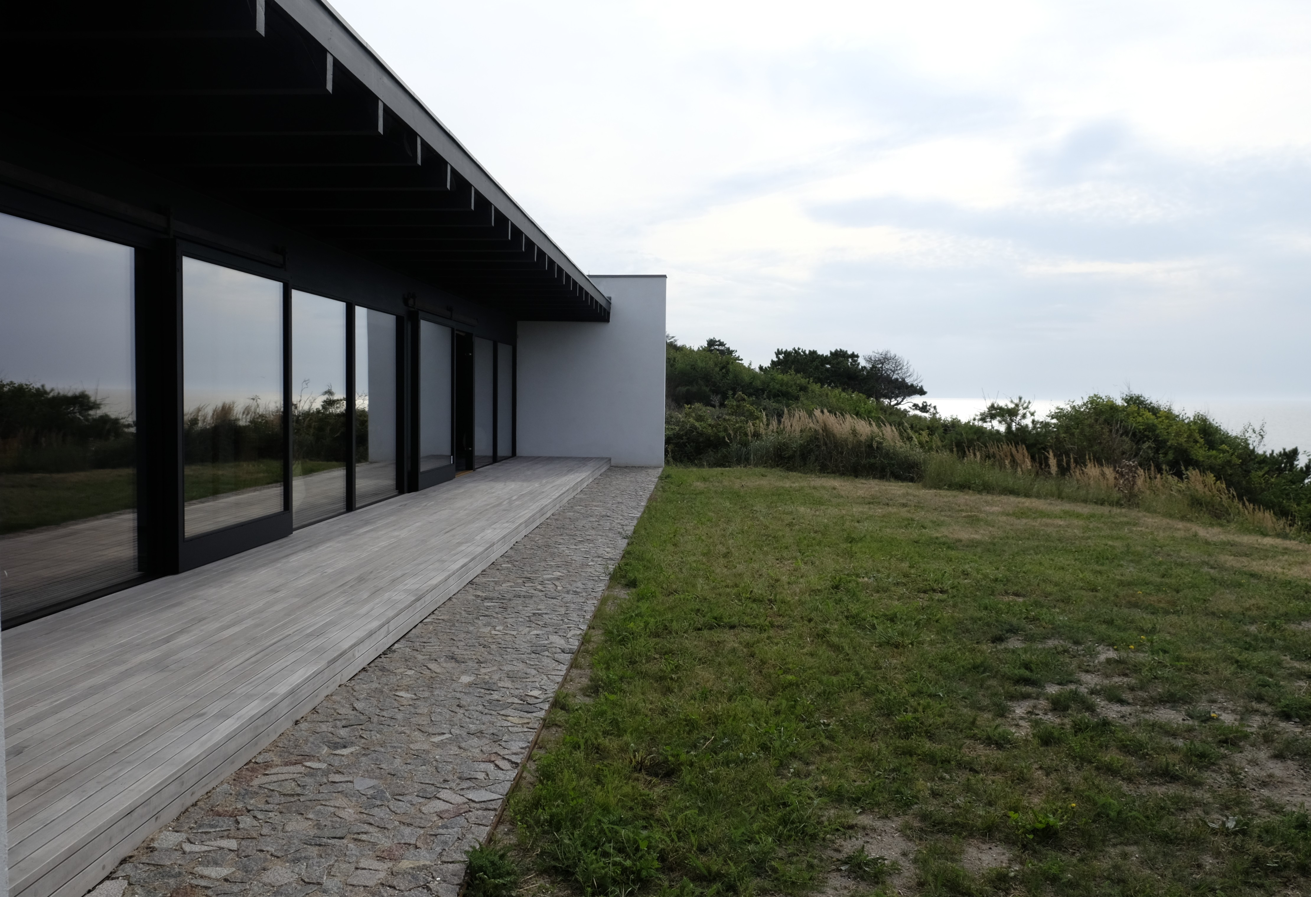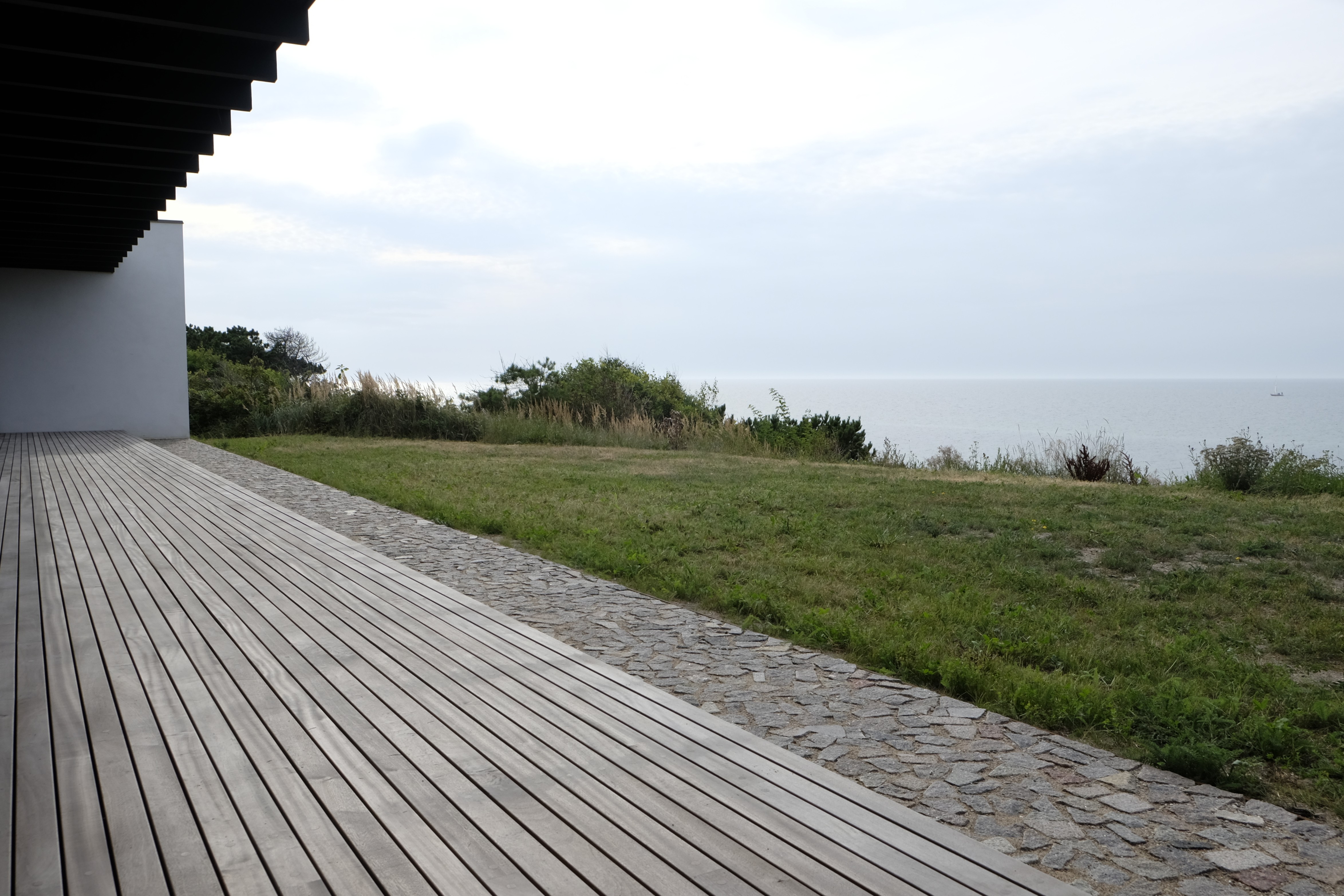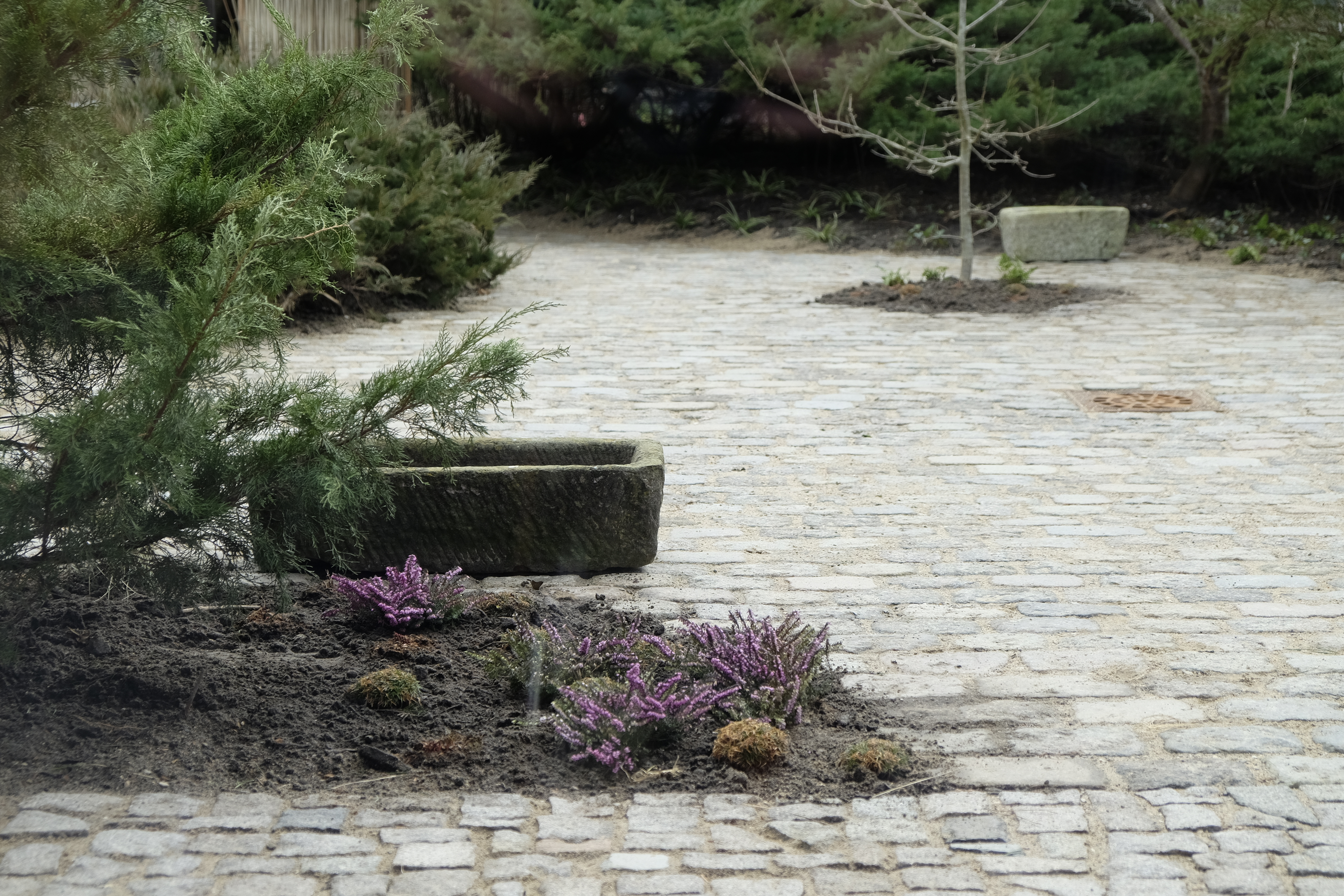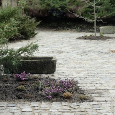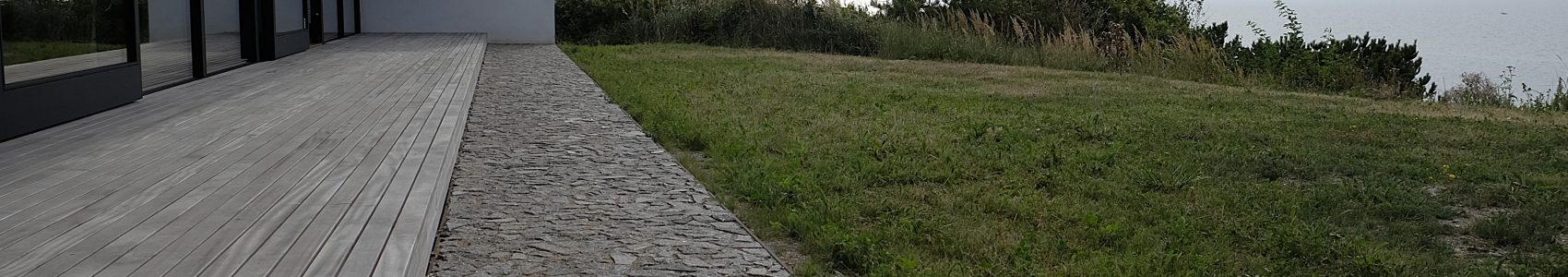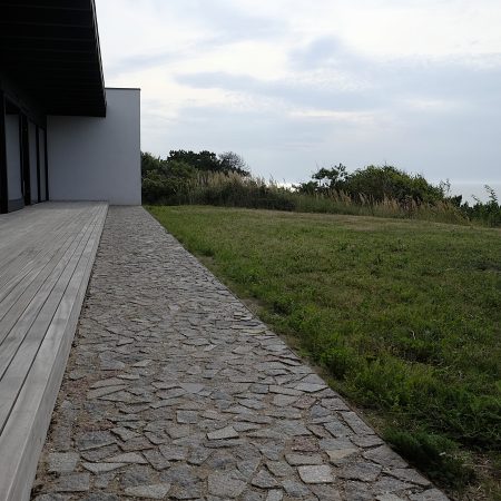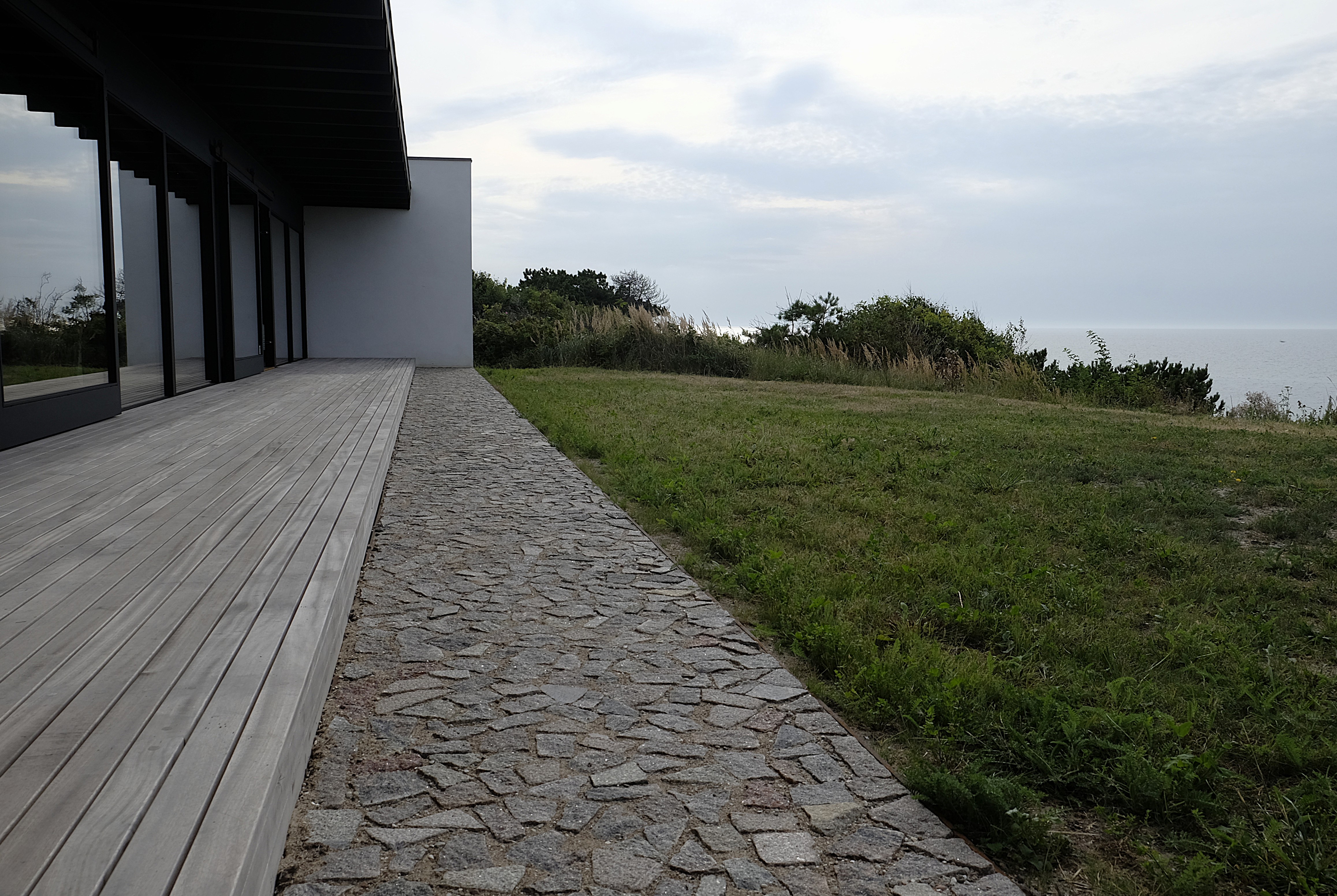 Det kakofoniske udtryk med brudfliser af nexøsandsten på den store gårdhaveterrasse er erstattet af blanke granitbrosten og som giver en mere rolig og samstemmende flade med resten af husets gulve og terrasser. Gårdspladsen er befæstet med søgrus/ perlesten af havslebet granit i forskellige farver og med en overrodnet varm tone.