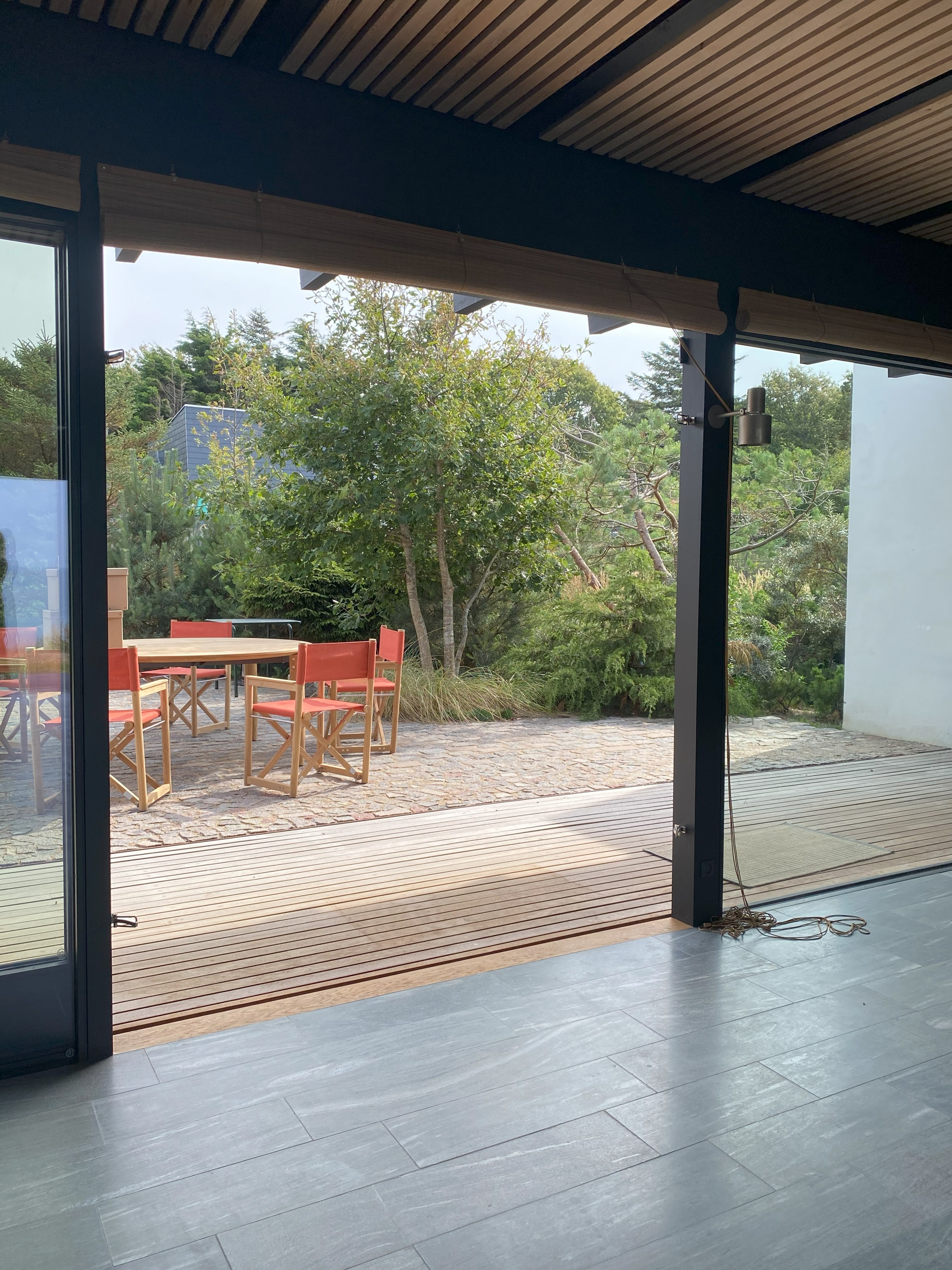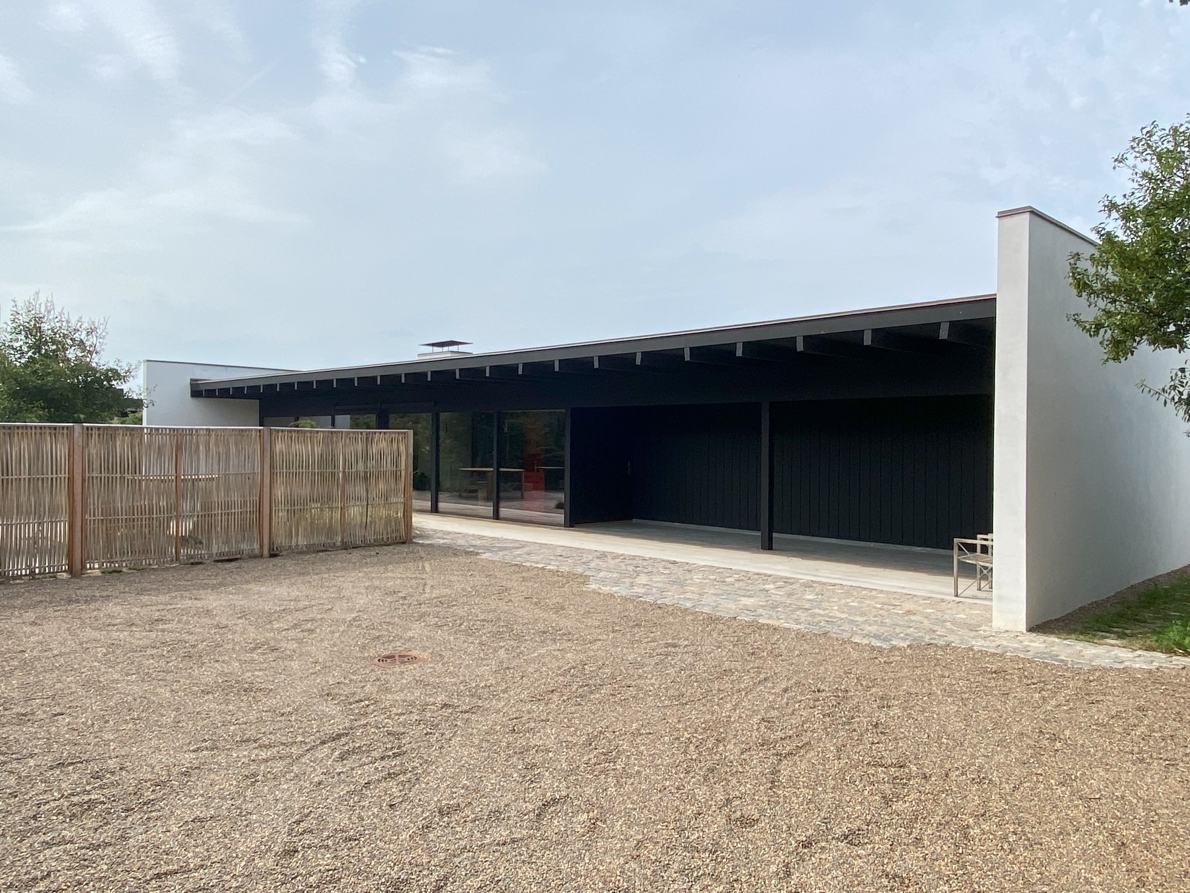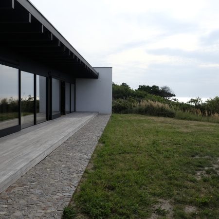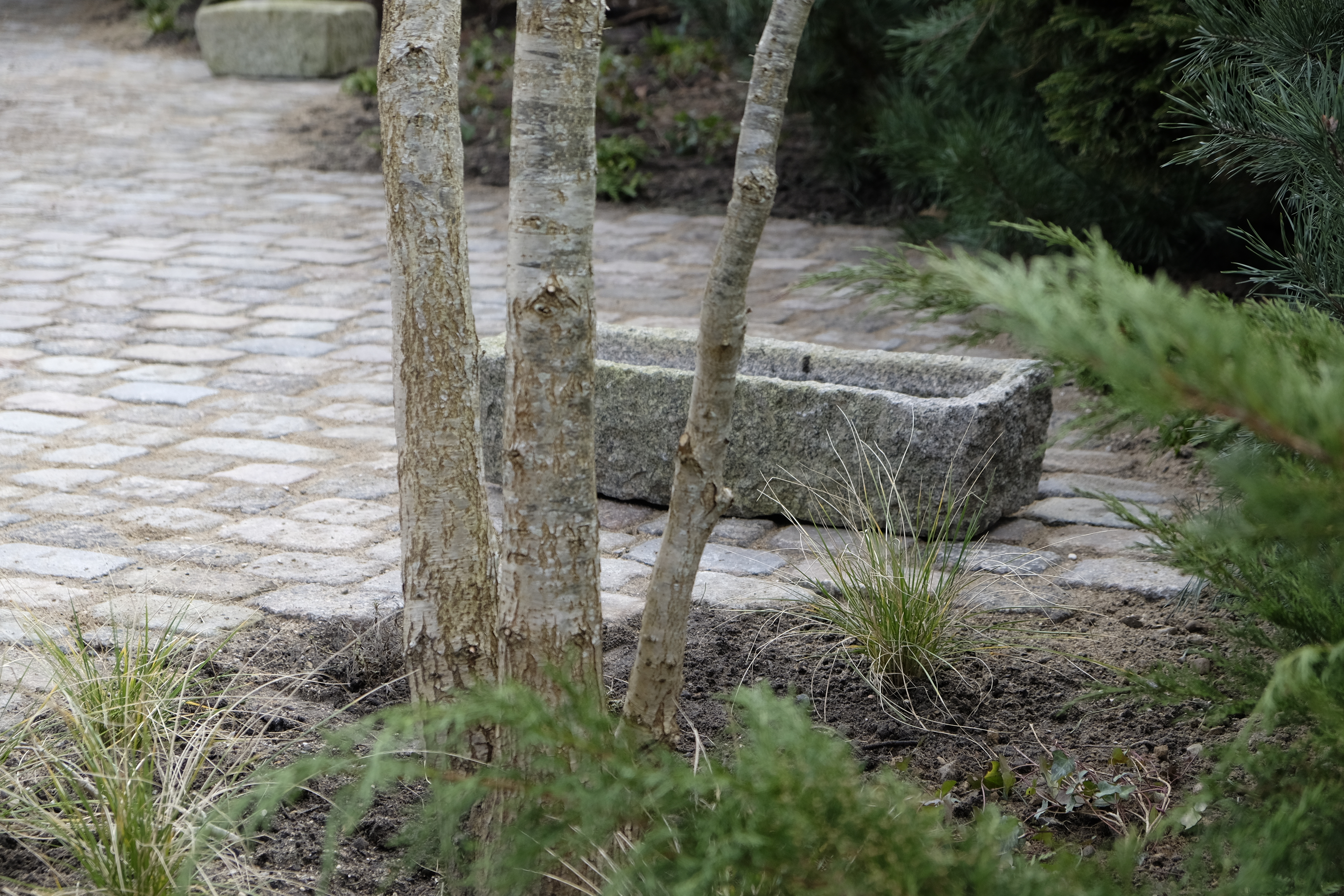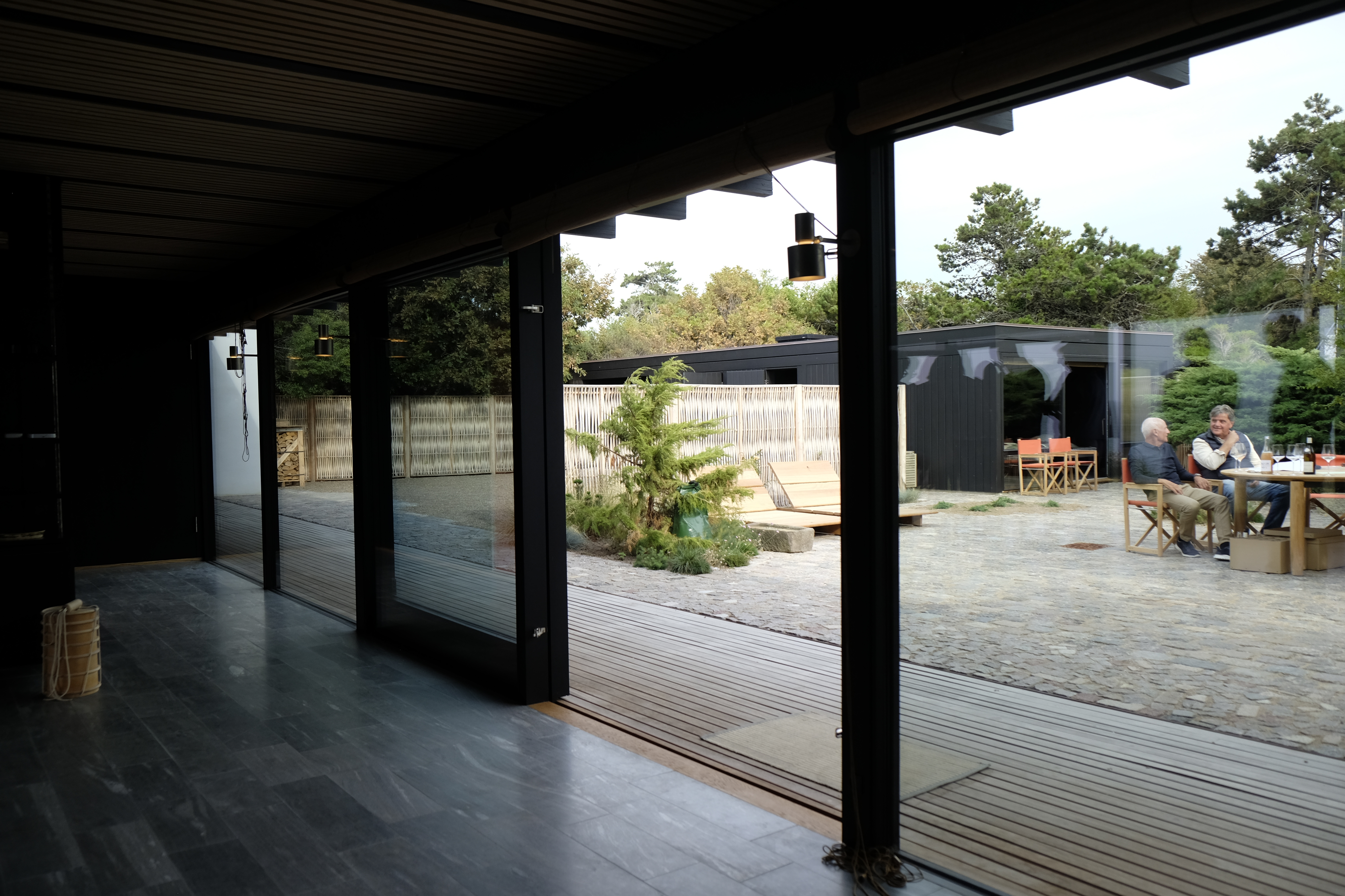 Det kakofoniske udtryk med brudfliser af nexøsandsten på den store gårdhaveterrasse er erstattet af blanke granitbrosten og som giver en mere rolig og samstemmende flade med resten af husets gulve og terrasser. Gårdspladsen er befæstet med søgrus/ perlesten af havslebet granit i forskellige farver og med en overrodnet varm tone.