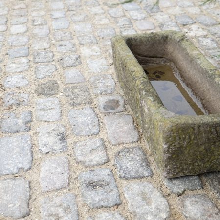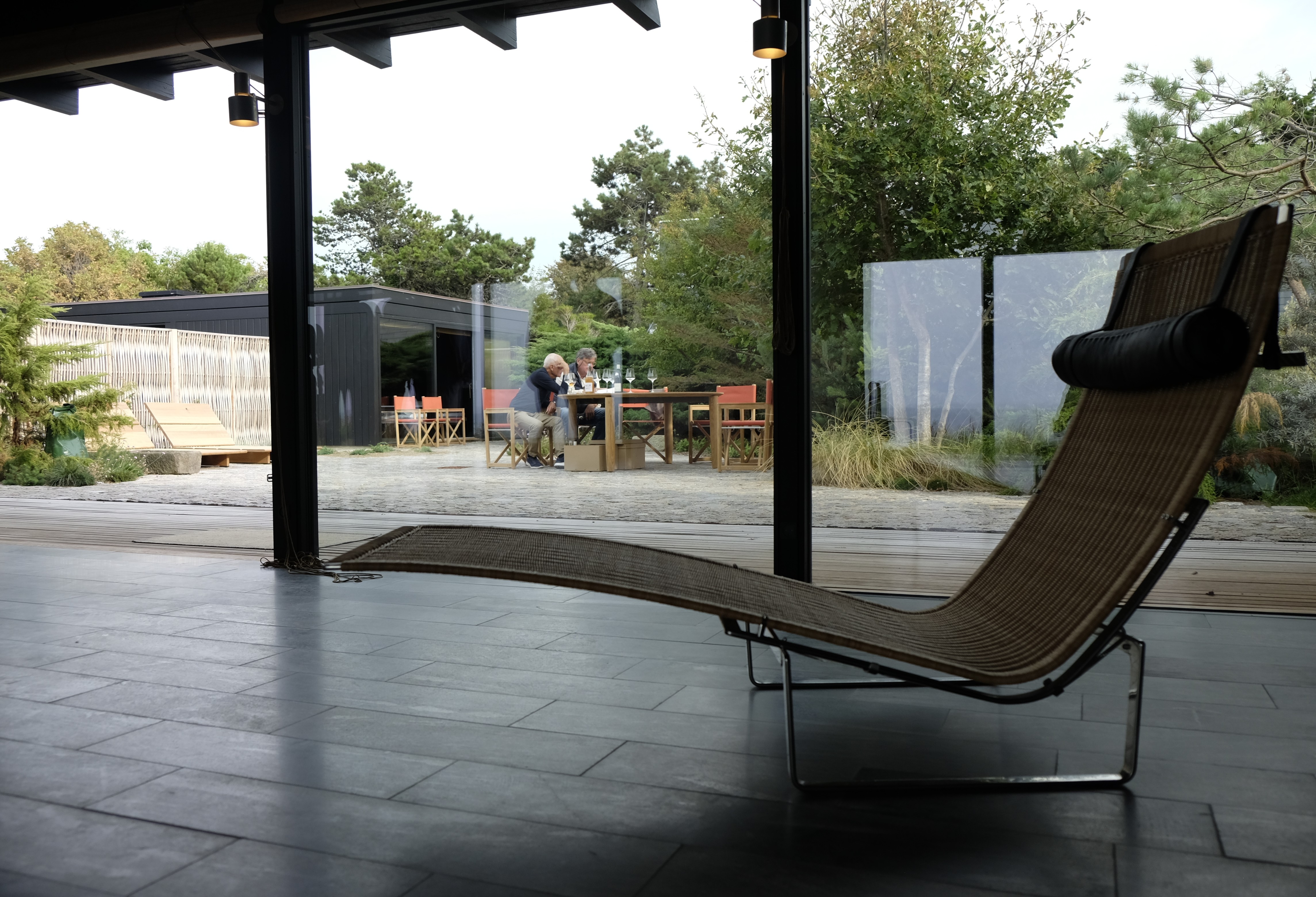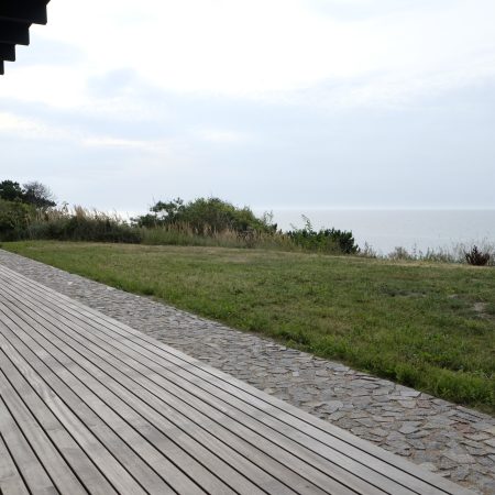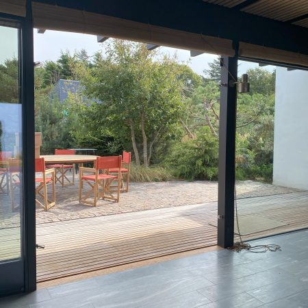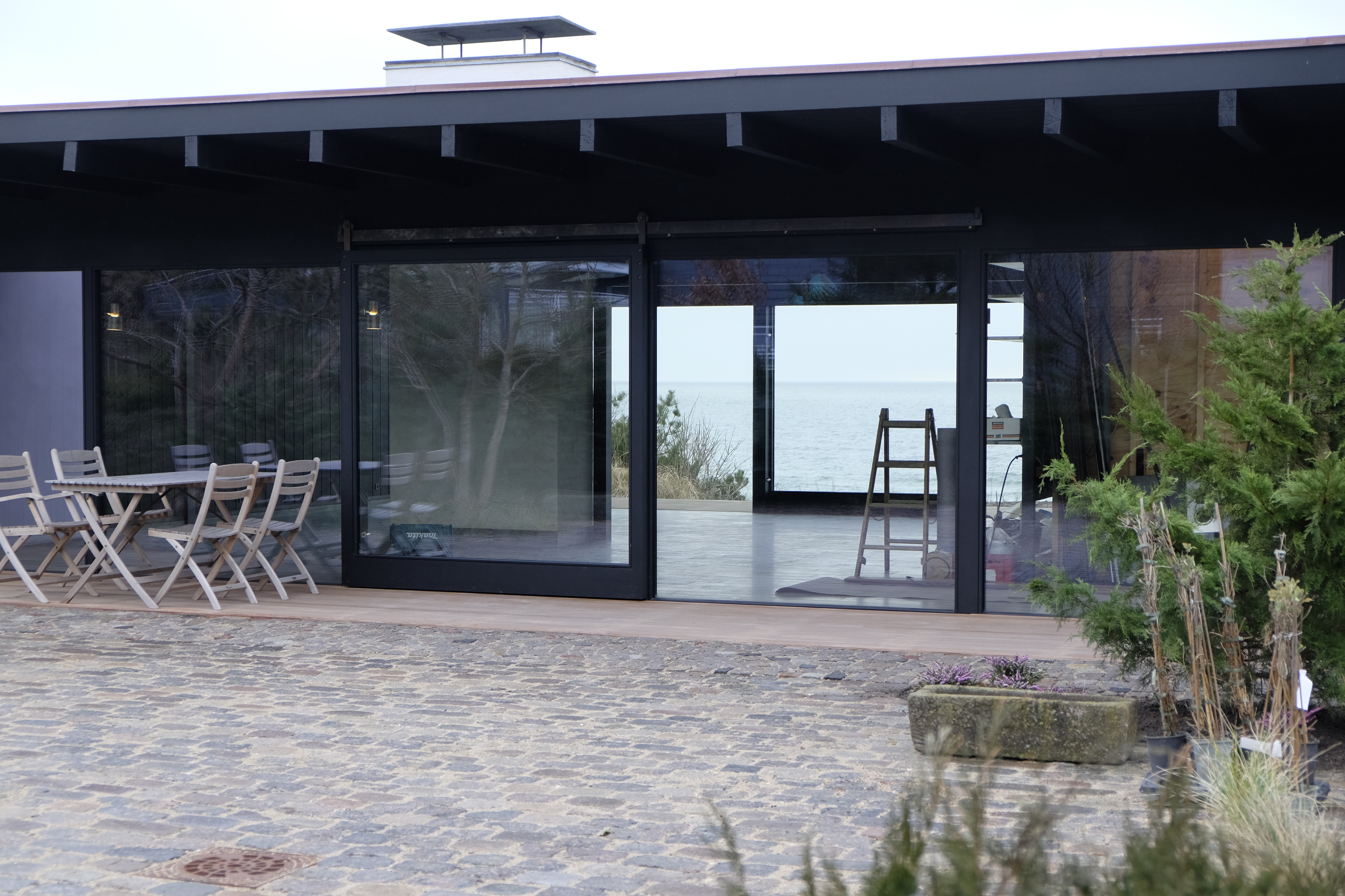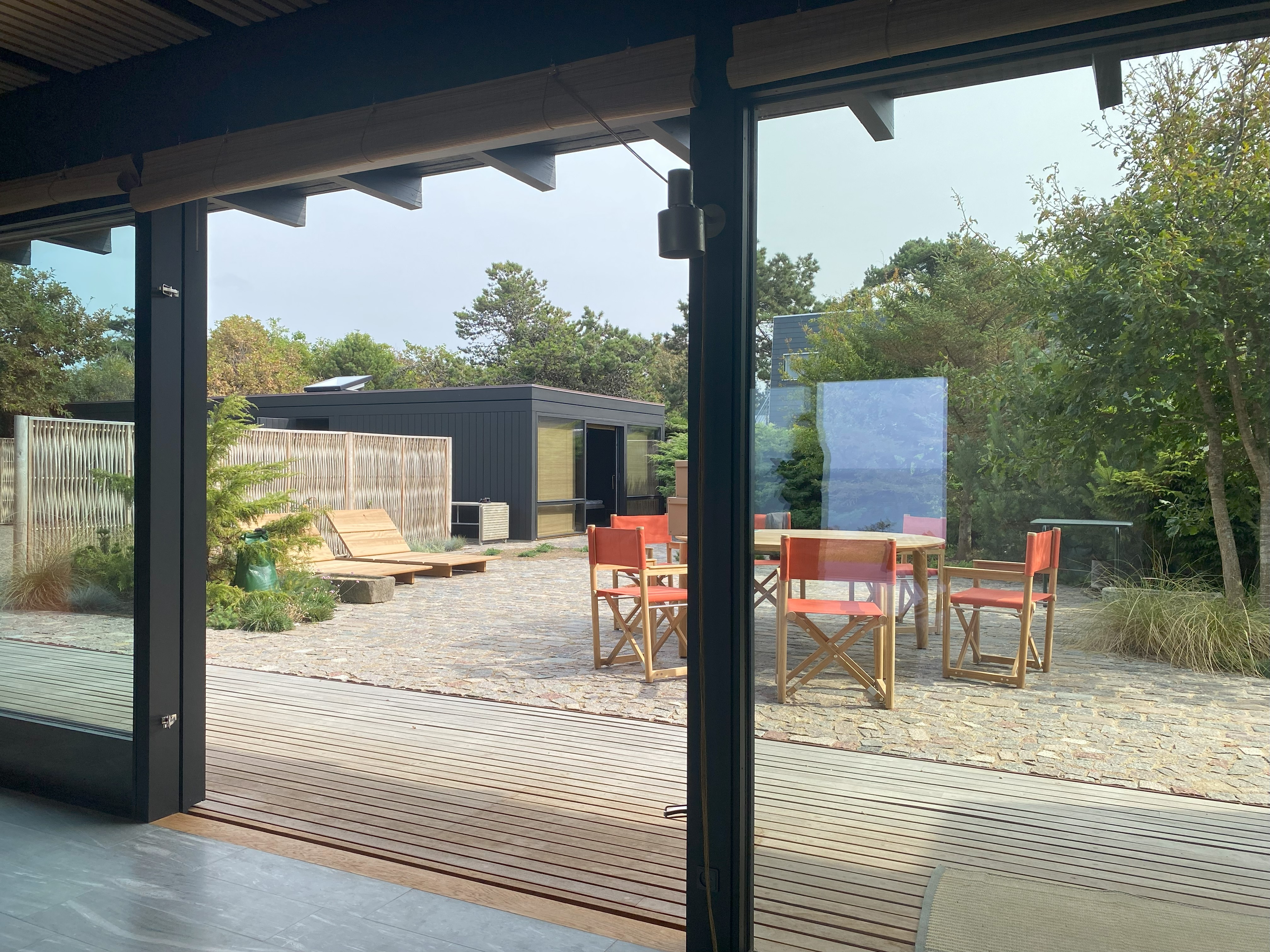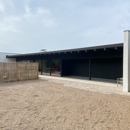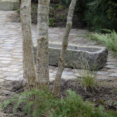 Det kakofoniske udtryk med brudfliser af nexøsandsten på den store gårdhaveterrasse er erstattet af blanke granitbrosten og som giver en mere rolig og samstemmende flade med resten af husets gulve og terrasser. Gårdspladsen er befæstet med søgrus/ perlesten af havslebet granit i forskellige farver og med en overrodnet varm tone.