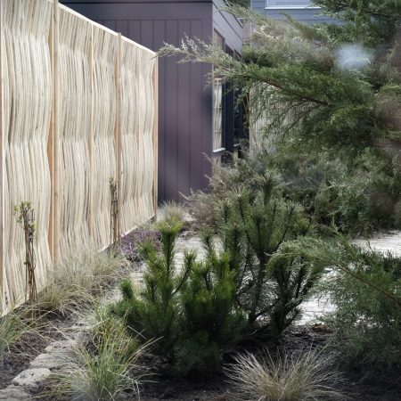 Forskellige kinesiske ener og en massiv selvsået vegetation på den gamle store terrasse af nexøbrud, var groet helt op til vinduerne på gårdrumssiden. Den er nu minimeret og trukket tilbage til en tæt og skærmende randbeplantning mod naboen, hvori der også er indplantet nye fyr og egetræer. Mange af de gamle ener er bevaret og der er plantet nye.