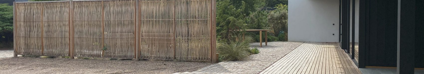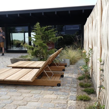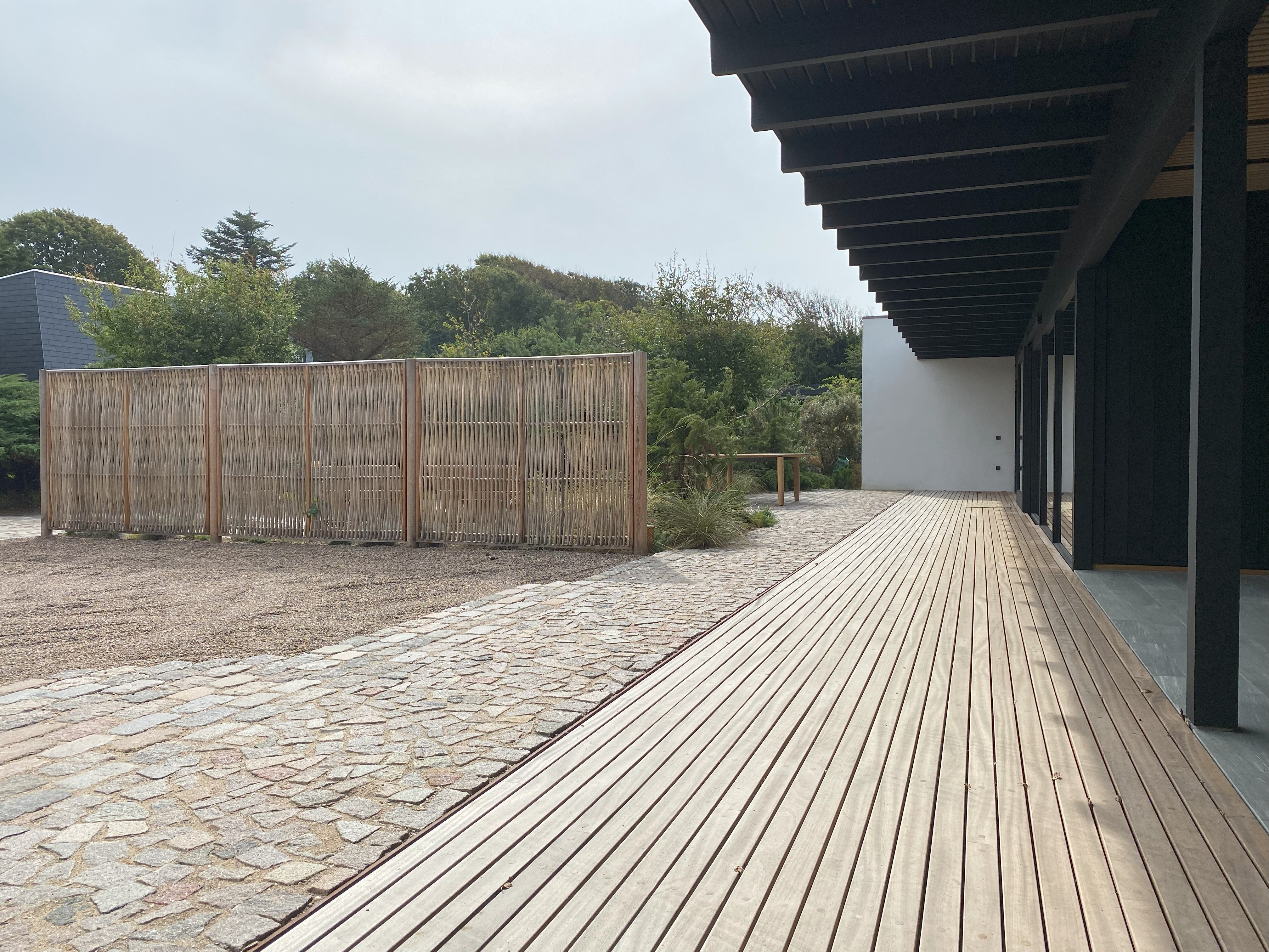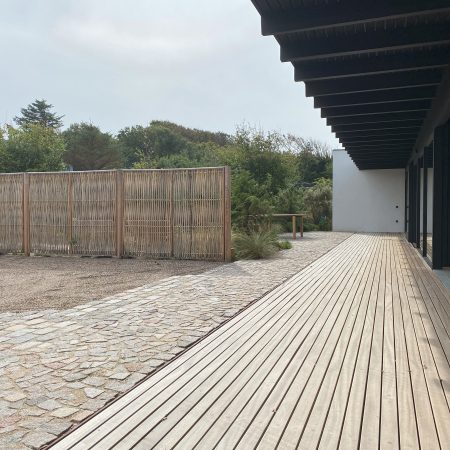 De gamle pileflethegn, der kun var rester tilbage af, er nu erstattet af nye specialdesignede og mere solide, med afbarkede og tykkere pilevidjer, flettet i rammer og monteret på runde pæle som de originale. De smalle terrasser under udhængene er genskabt af lister i nøjagtig samme dimensioner, men udvidet så de stemmer overens med huset ved Rungsted. En ny tilføjelse, er de smalle borter af flækkede chaussésten, der dels skaber overgang til græsarealet mod kysten og den nye befæstelse i gårdrummet, hvortil der altid har været niveaufri adgang.